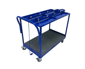 - 3. Swiveling casters and a handle allowed the technician to transport the cart to the autoclave machine.